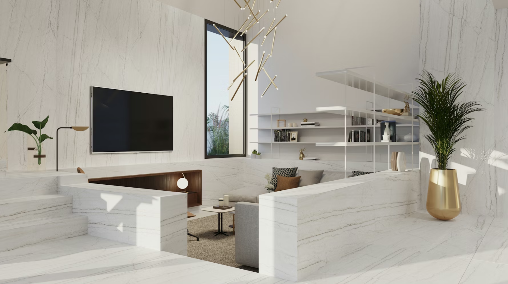 A light cream-toned base with fine, pale veins that run through the marbling, creating a fascinating neural network that moves in the same direction. Limbo has a polished finish.